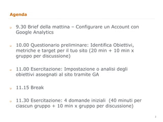Il documento fornisce una guida dettagliata su come configurare e utilizzare Google Analytics per il monitoraggio dei siti web. Include istruzioni su creare un account, impostare obiettivi, analizzare il traffico e utilizzare filtri per ottimizzare i dati raccolti. Viene enfatizzato l'importanza della personalizzazione e della corretta configurazione per massimizzare il valore delle analytics nel social media marketing.