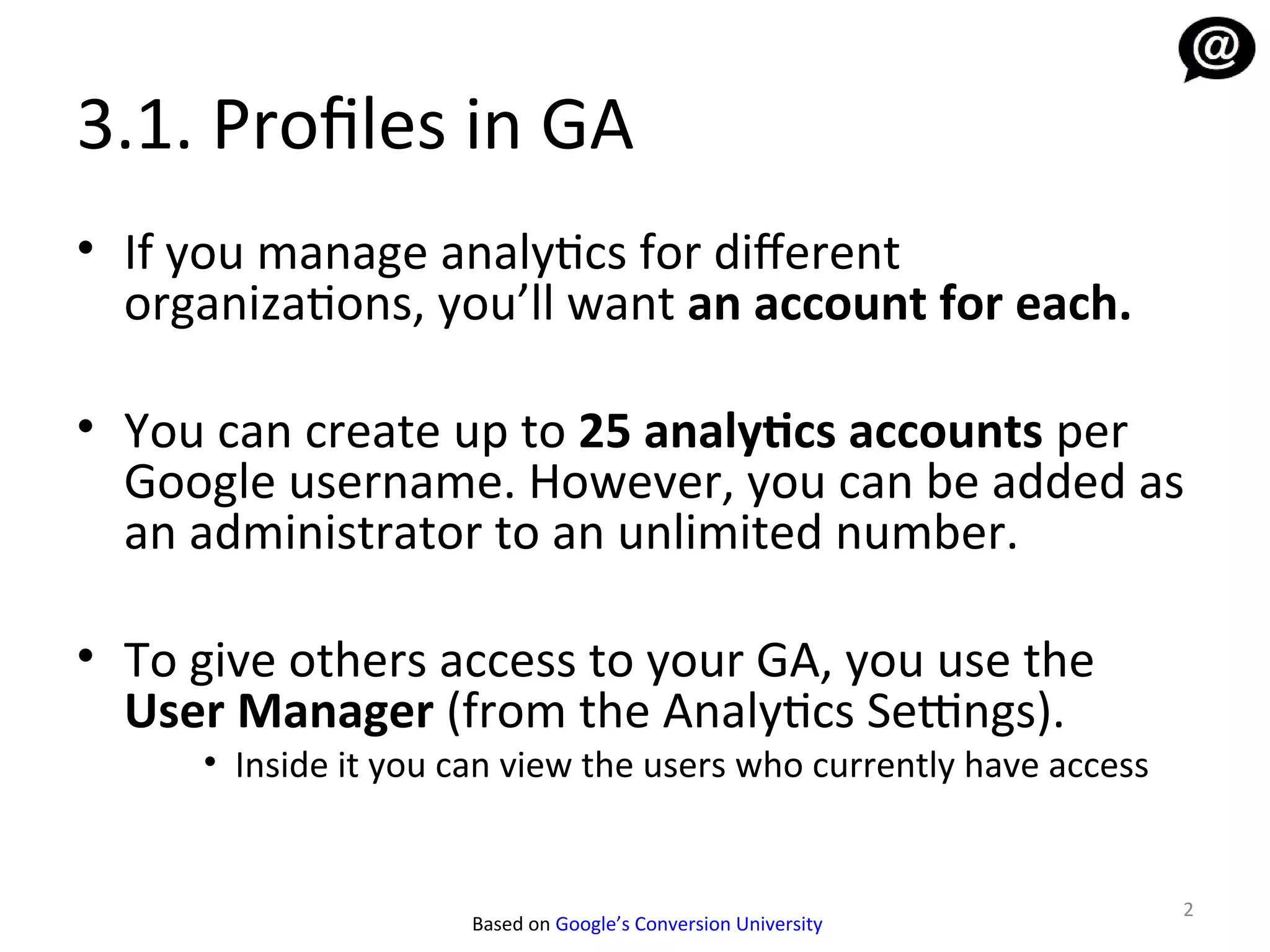 - You can create up to 25 Google Analytics accounts per user, with profiles to separate different organizations or parts of a site.