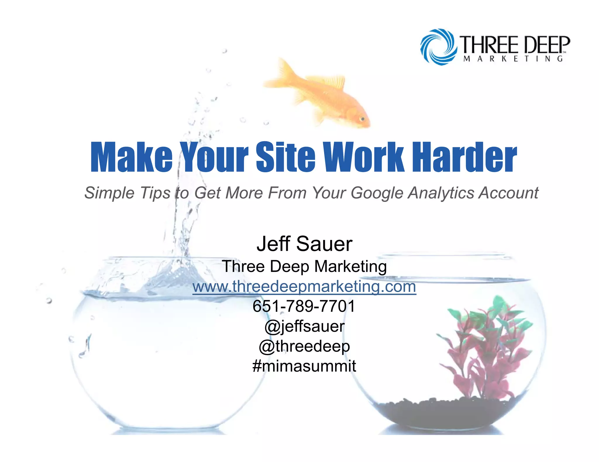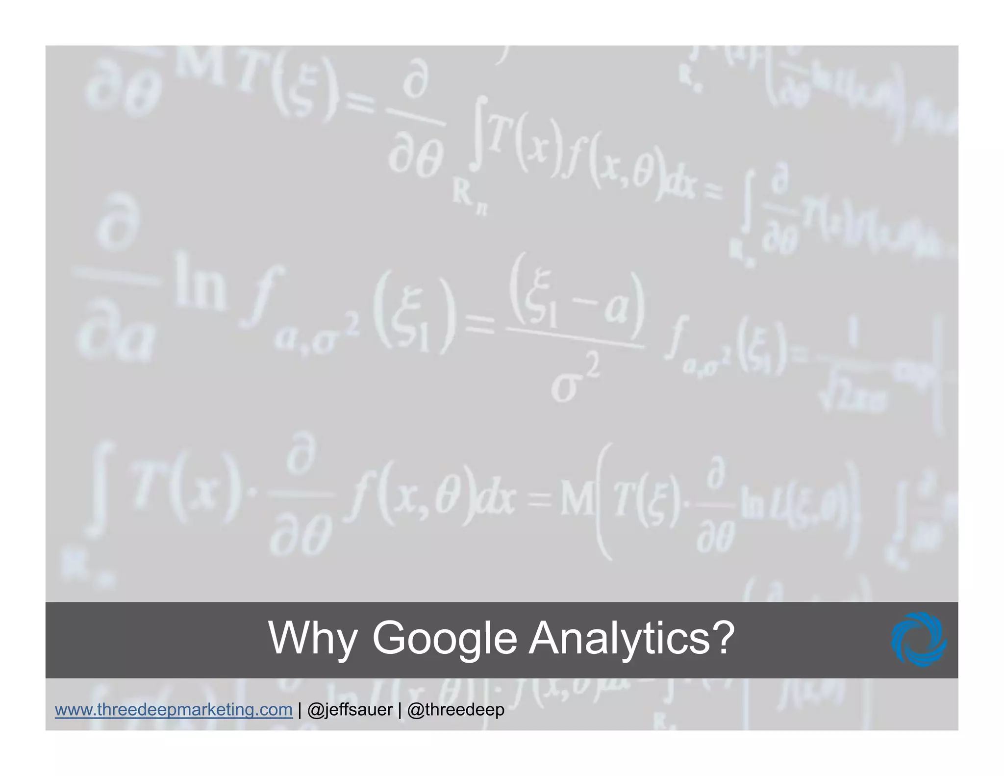 This document provides tips for getting more value from a Google Analytics account, including tracking social media, emails, customizing dashboards, blocking internal traffic, setting up goals and funnels, improving website URLs, and linking Google AdWords accounts. Key recommendations include using tracking URLs to measure social media traffic, filtering reports to remove internal users, customizing dashboards to show important metrics, defining goals to understand website value, and linking AdWords to analyze paid search performance. The overall message is that taking these steps can provide deeper insights and accountability to optimize digital marketing efforts.