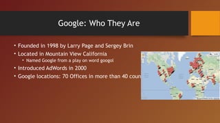 Google Analytics is a free tool offered by Google that allows users to track and analyze website traffic. It provides metrics on visitors, traffic sources, popular content, and how traffic changes over time. Users can gain insights into what drives traffic to their site and how to improve conversions. Google Analytics has a basic free version for sites with up to 5 million pageviews per month and premium versions for unlimited traffic.