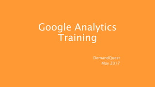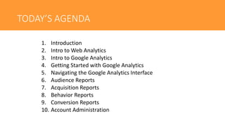 This document provides an agenda for a Google Analytics training session. The agenda includes topics such as getting started with Google Analytics, navigating the interface, audience, acquisition, behavior, and conversion reports. It also covers account administration, advanced tracking implementations, measuring content, importing and extracting data, and common applications of Google Analytics. The training emphasizes using Google Analytics for analysis rather than just reporting, and how to tell data-driven stories to different audiences. It provides best practices for setting up views and segments, understanding users, tracking campaigns and visitor engagement, and setting up conversion goals.