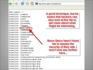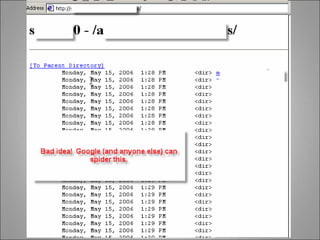 The document provides an overview of advanced search engine techniques, primarily focusing on Google, including how Google works, advanced search operators, and various methods for information disclosure. It discusses Google hacking strategies, tools available for security assessments, and countermeasures to protect websites from vulnerabilities. Additionally, it presents practical examples of using Google for penetration testing and auditing websites for security risks.