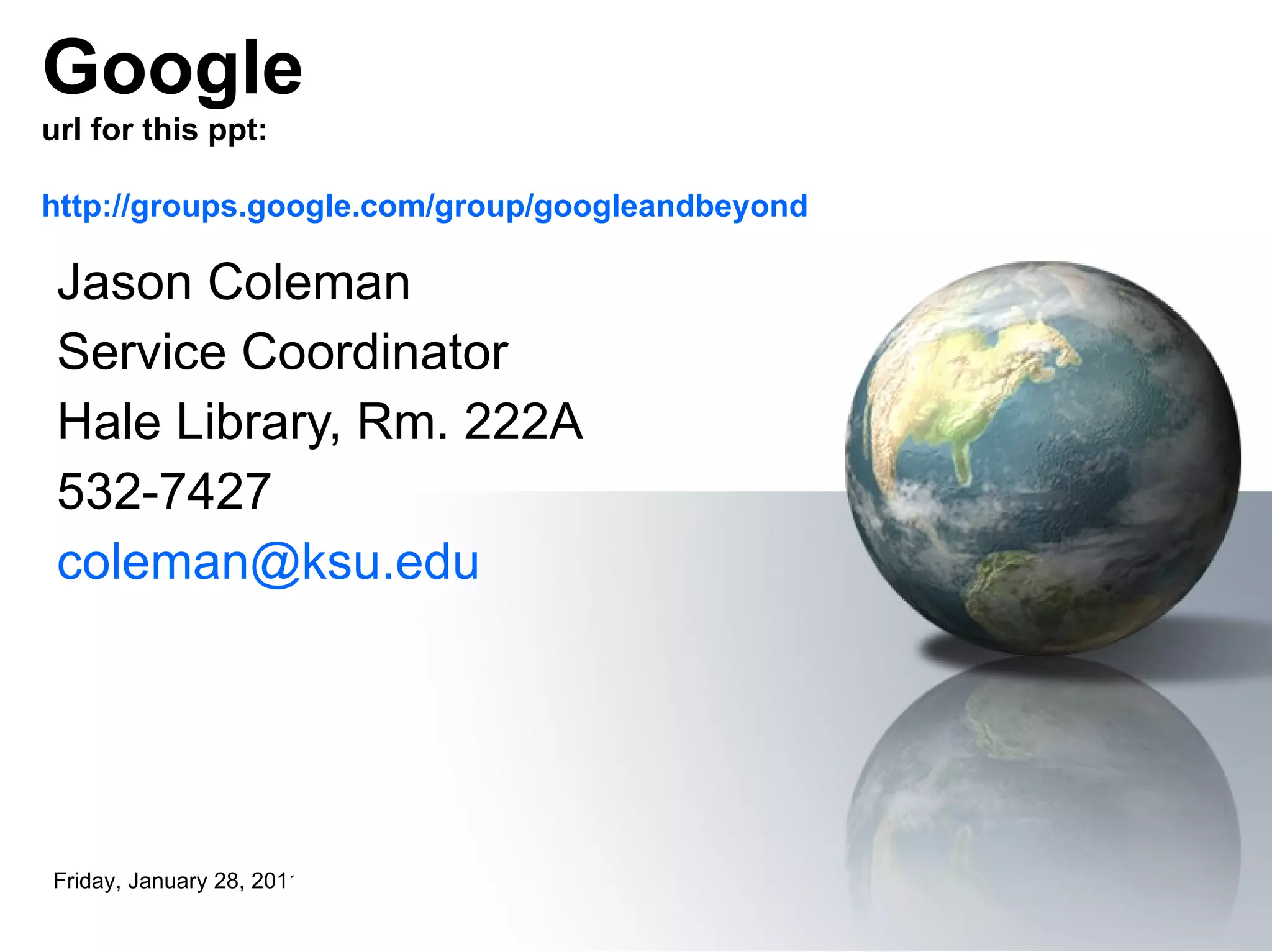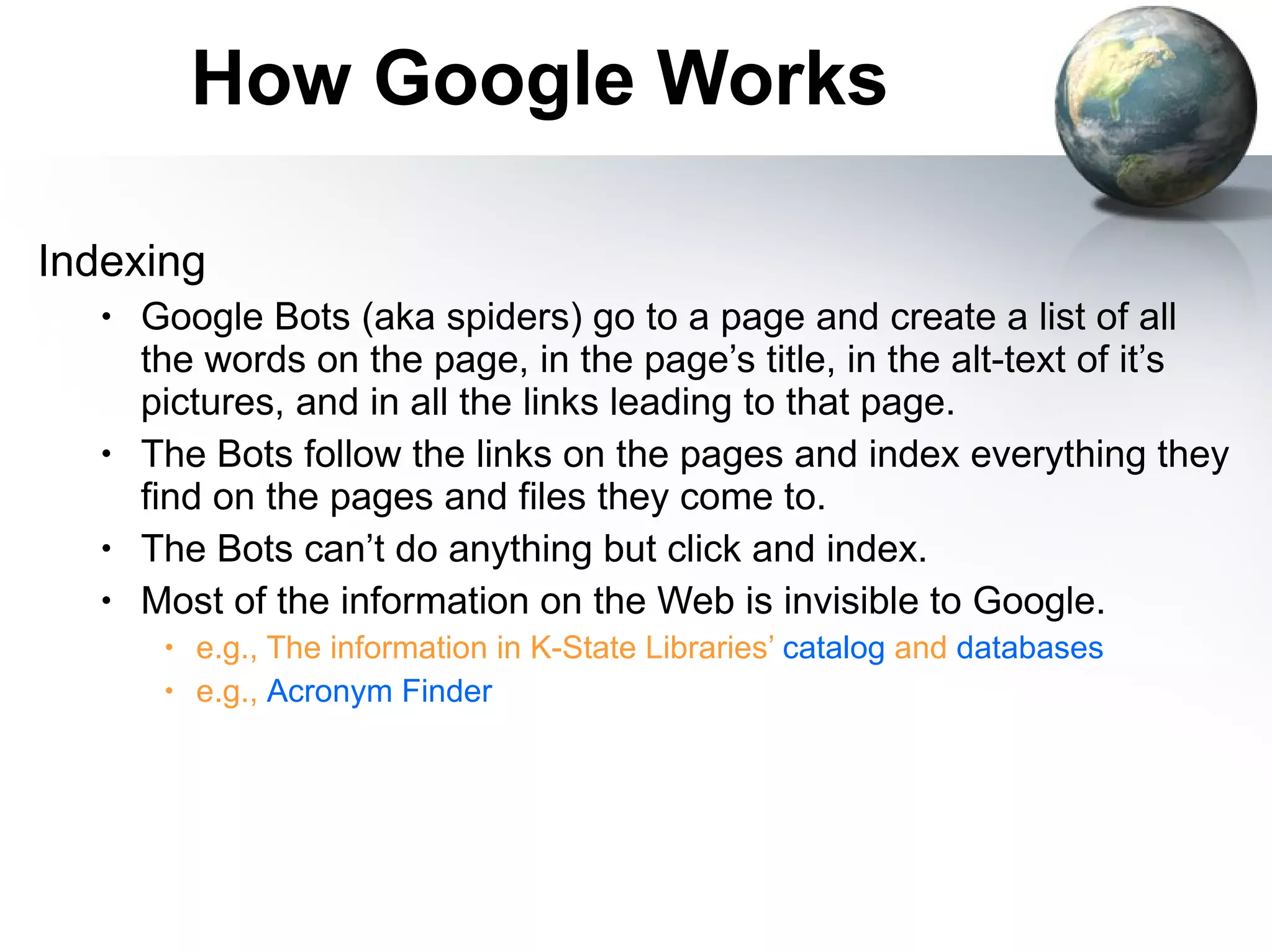 The document provides an overview of how Google works including how it indexes web pages, performs searches, and ranks search results. It also describes various search techniques like using quotation marks, Boolean operators, and limits to refine searches. Tips are provided for using Google as a calculator, dictionary, phone directory, and for getting weather or facts. Links to additional resources on searching Google and Google Scholar are also included.