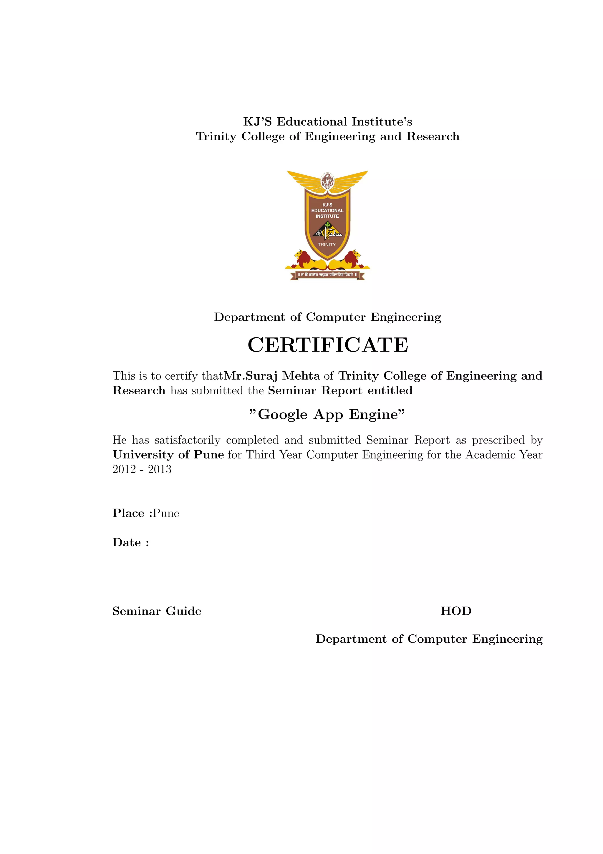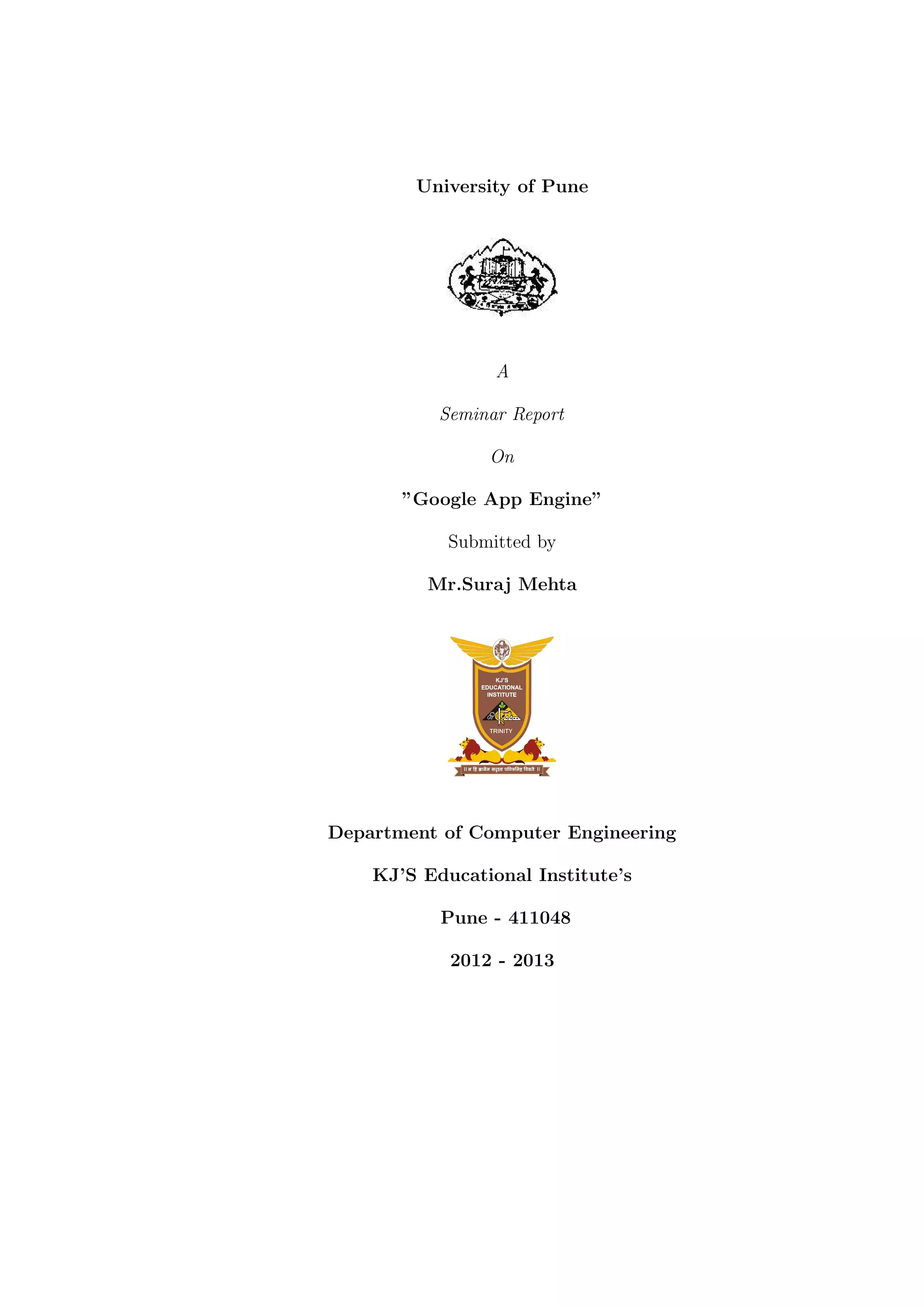 Mr. Suraj Mehta submitted a seminar report on "Google App Engine" to the Department of Computer Engineering at KJ's Educational Institute in Pune, India. The report provides an overview of Google App Engine, including how it works, its storage management, development workflow, quotas and limits, and a proposed framework for using App Engine for parameter studies. It also discusses advantages, disadvantages, and compares App Engine to other cloud platforms. The seminar guide and HOD of the Computer Engineering department certified that Mehta satisfactorily completed the report as required.
