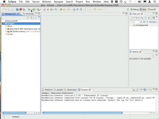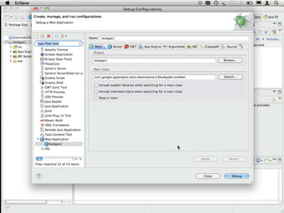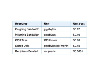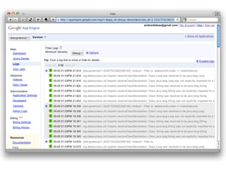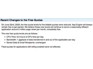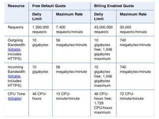 Google App Engine is a PaaS that allows developers to build and host web applications in the Google cloud. The document summarizes a workshop on using the Java runtime environment on GAE. It discusses the SDKs, deploying and managing apps on GAE, data storage using the datastore, and limitations like the 30-second request limit. The biggest benefits of GAE are scalability and low startup costs, while the hardest limit is the 30-second request processing time.