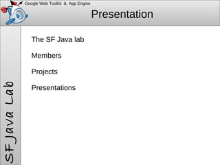 This document discusses Google Web Toolkit (GWT) and Google App Engine (GAE). GWT allows developers to write code in Java that compiles to JavaScript, enabling Ajax-style web development without browser plugins. GAE provides a scalable hosting environment on Google's infrastructure. The document outlines benefits of both technologies, such as reusable components and free hosting, as well as some limitations like GWT's single-threaded model. It also demonstrates how to build widgets, handle persistence, and provides links for further information.