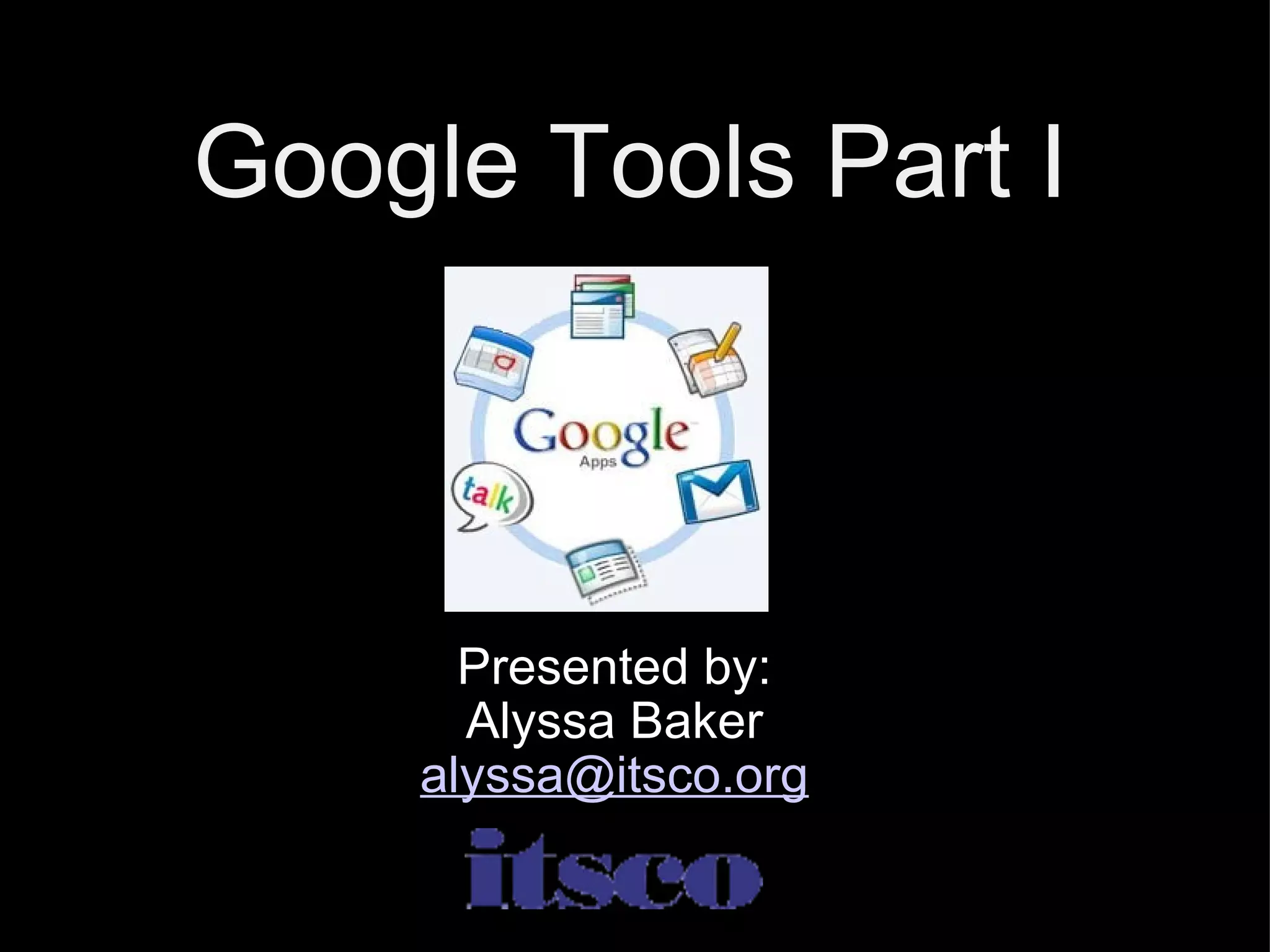 ![Google Tools Part I Presented by: Alyssa Baker [email_address]](https://image.slidesharecdn.com/googleapps-090604080829-phpapp02/75/Google-Apps-1-2048.jpg)