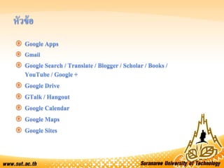 Google apps content_1 2. 3. Google Apps คือชุดแอปพลิเคชันของ Google ที่รวบรวม