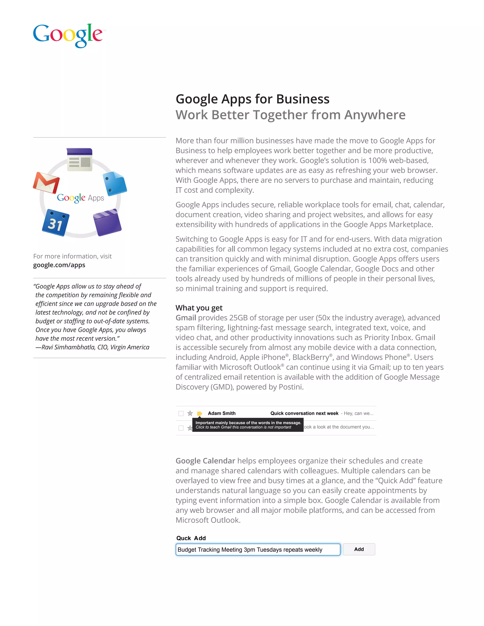 Google Apps for Business allows companies to easily switch to secure, reliable workplace tools for communication and collaboration. It offers Gmail, Google Calendar, Docs and other familiar tools with no servers to maintain and continuous innovation without upgrade hassles. Over 4 million businesses use Google Apps to help employees work better together from anywhere with proven productivity gains and cost savings.