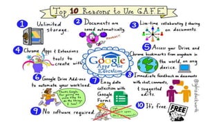 G Suite for Education is a free suite of productivity apps including Google Docs, Slides, Sheets, Forms, Sites, Calendar and Talk that is offered to schools. It allows for real-time collaborative work. Teachers can create classes, distribute and provide feedback on assignments through Google Classroom. Documents and sites can be shared privately within the school or publicly. The suite encourages teamwork, offers flexibility through choice of devices, and is affordable to manage at scale.