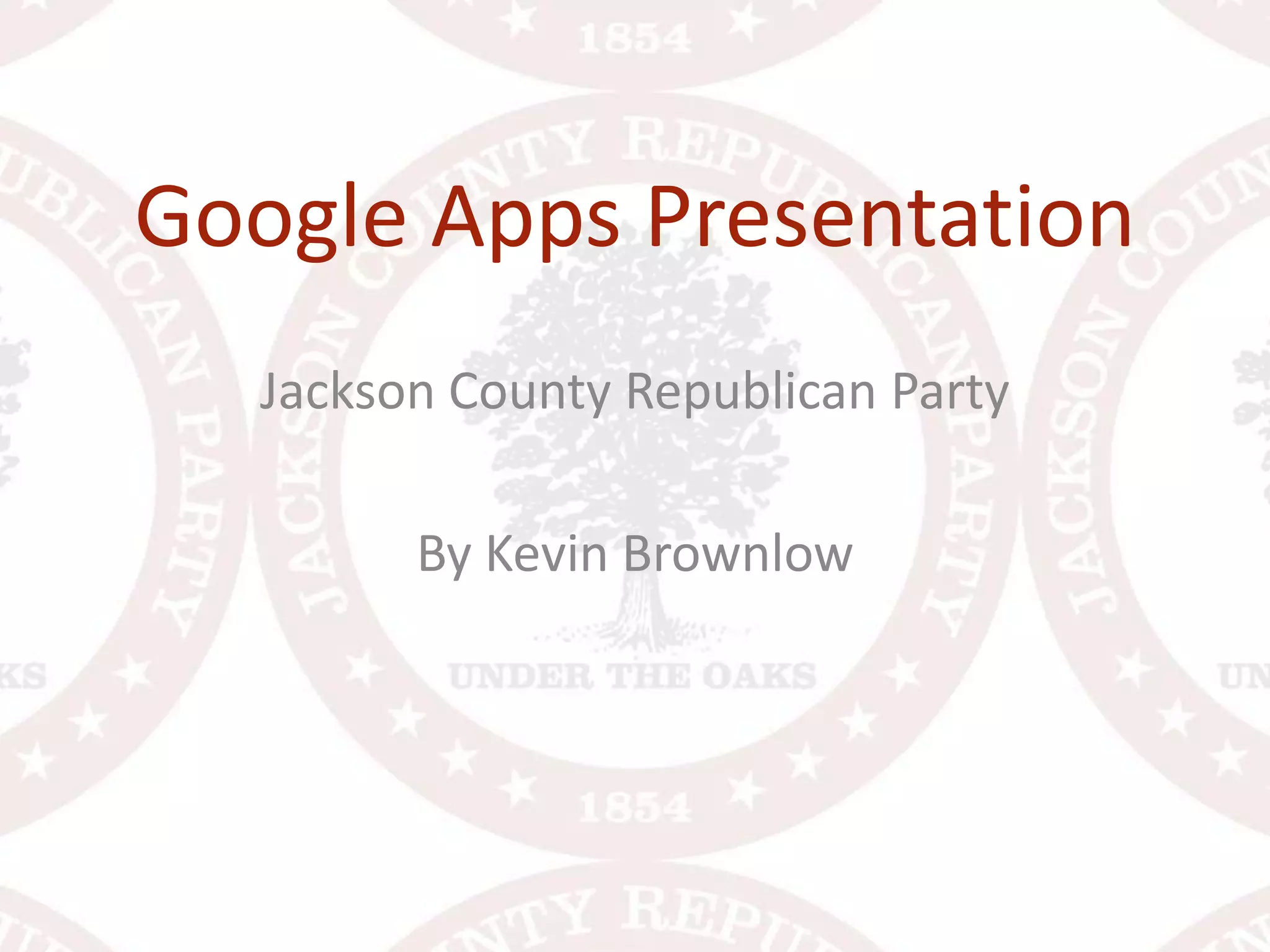 The document discusses Google Apps and its components that could benefit the Jackson County Republican Party (JCRC). The key components are Gmail for email, Google Docs for document creation and sharing, and Google Calendar for event scheduling. Some benefits highlighted are a universal login, access on mobile devices, powerful spam filtering, document collaboration, and a shared calendar for all party events - and the best part is that it's free to use.