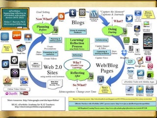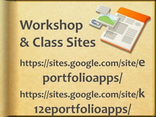 The document discusses using ePortfolios to support student learning and outlines an agenda for a workshop on implementing ePortfolios using Google Apps. It describes different levels of ePortfolios from basic collection to more advanced sites for reflection and sharing, and covers topics like digital storytelling and using ePortfolios for professional development. Contact information is provided for joining related online discussions around the hashtag #eportfolios.