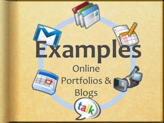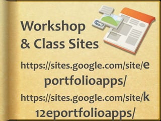 This document provides an agenda for an electronic portfolio workshop. The agenda includes introductions, defining electronic portfolios, using Google Apps for eportfolios, and topics like reflection, feedback, Google Sites, digital storytelling, and professional development. Attendees will be introduced to different levels of electronic portfolios using Google Docs, Blogger, and Google Sites. They will also discuss the benefits of portfolios and how portfolios can support lifelong learning.