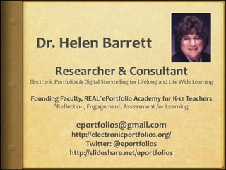 The document provides an agenda for a workshop on electronic portfolios, outlining the purpose and benefits of ePortfolios, how to create ePortfolios using Google Apps, and strategies for capturing digital artifacts and facilitating reflection. Sample student portfolio examples and resources are referenced to illustrate concepts. The overall goal is to empower students through self-reflection and digital storytelling using electronic portfolios.