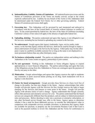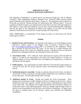 This addendum modifies the Google Blogger Terms of Service for use by a federal agency. Key points include: