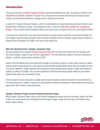 1. The document provides guidance on optimizing a Google+ business page for search engine visibility and marketing purposes. It explains that Google+ pages can appear in organic search results, extending the reach of posts.