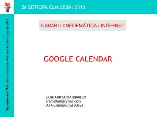 Experiències TAC a la Formació de Persones Adultes | juny de 2010 GOOGLE CALENDAR LUIS MIRANDA ESPEJO [email_address] AFA Eramprunyà /Gavà USUARI I /INFORMÀTICA / INTERNET 5è SETICPA Curs 2009 / 2010