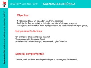 Amb la mateixa contrasenya , fer-se un Google Calendar 5è SETICPA Curs 2009 / 2010 Objectius 1- Objectiu: Crear un calendari electrònic personal 2- Objectiu: Fer servir l’eina del calendari electrònic com a agenda 2- Objectiu: Fer-lo servir com a programador de cites individuals o per grups, Material complementari Tutorial, amb els trets més importants per a començar a fer-lo servir. · AGENDA ELECTRÒNICA