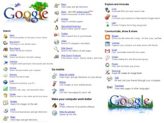 The document discusses Google's business strategy and potential areas for expansion. It summarizes that Google started as a search engine and used innovative paid listing and algorithmic models to grow rapidly. While competitors pursued diversification, Google achieved differentiation through superior search quality and a focus on innovation. The summary recommends that Google continue focusing on its core search competency in line with its 70-20-10 strategy, given its competitive advantages in this area. Direct competition with established players in other domains like portals, ecommerce or operating systems would be challenging.