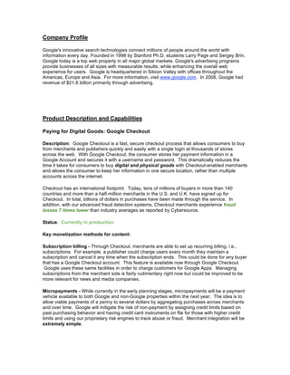 Google provides a summary of its capabilities to help newspapers monetize digital content through subscriptions and advertising. It describes Google Checkout for processing subscriptions and payments. It outlines a vision of providing single sign-on for accessing subscribed content across sites, bundling subscriptions from multiple publishers, and offering various tiers of search access. Google also describes its advertising platforms and syndication services to help publishers monetize content.