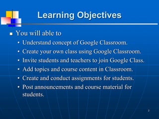 The document outlines the functionalities and benefits of Google Classroom, a free educational platform for schools and colleges. It provides detailed instructions on creating a class, inviting students, adding course content, creating assignments, and posting announcements. Additionally, it emphasizes the significance of technology in modern education.