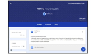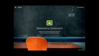 Google Classroom allows teachers to create classes, distribute assignments, provide feedback and communicate with students. It provides a paperless way for teachers to organize assignments, resources and student work. Students benefit from having all class materials and tasks centralized in one place, and can easily submit work and receive feedback from teachers. Teachers say the best features are how it saves time, keeps classes organized, and facilitates the submission and marking of student work in a digital format.