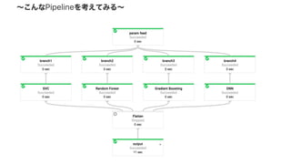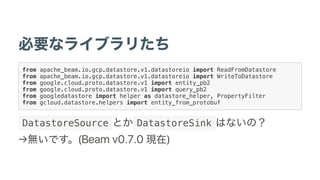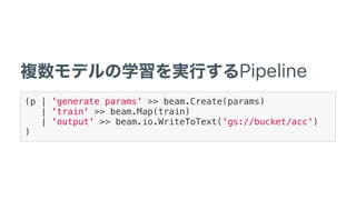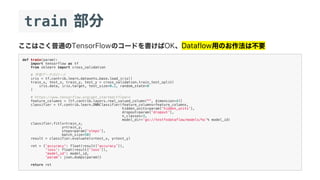 Google Cloud Dataflow can be used to build TensorFlow pipelines. Dataflow allows training multiple TensorFlow models in parallel and writing results to Cloud Datastore. A sample pipeline shows generating training parameters, mapping over them to train models, and writing accuracy results to Cloud Storage. Dataflow provides autoscaling and machine types can be configured. The new DatastoreIO allows reading from and writing to Cloud Datastore from Dataflow pipelines using Protobuf and entity conversion helpers.