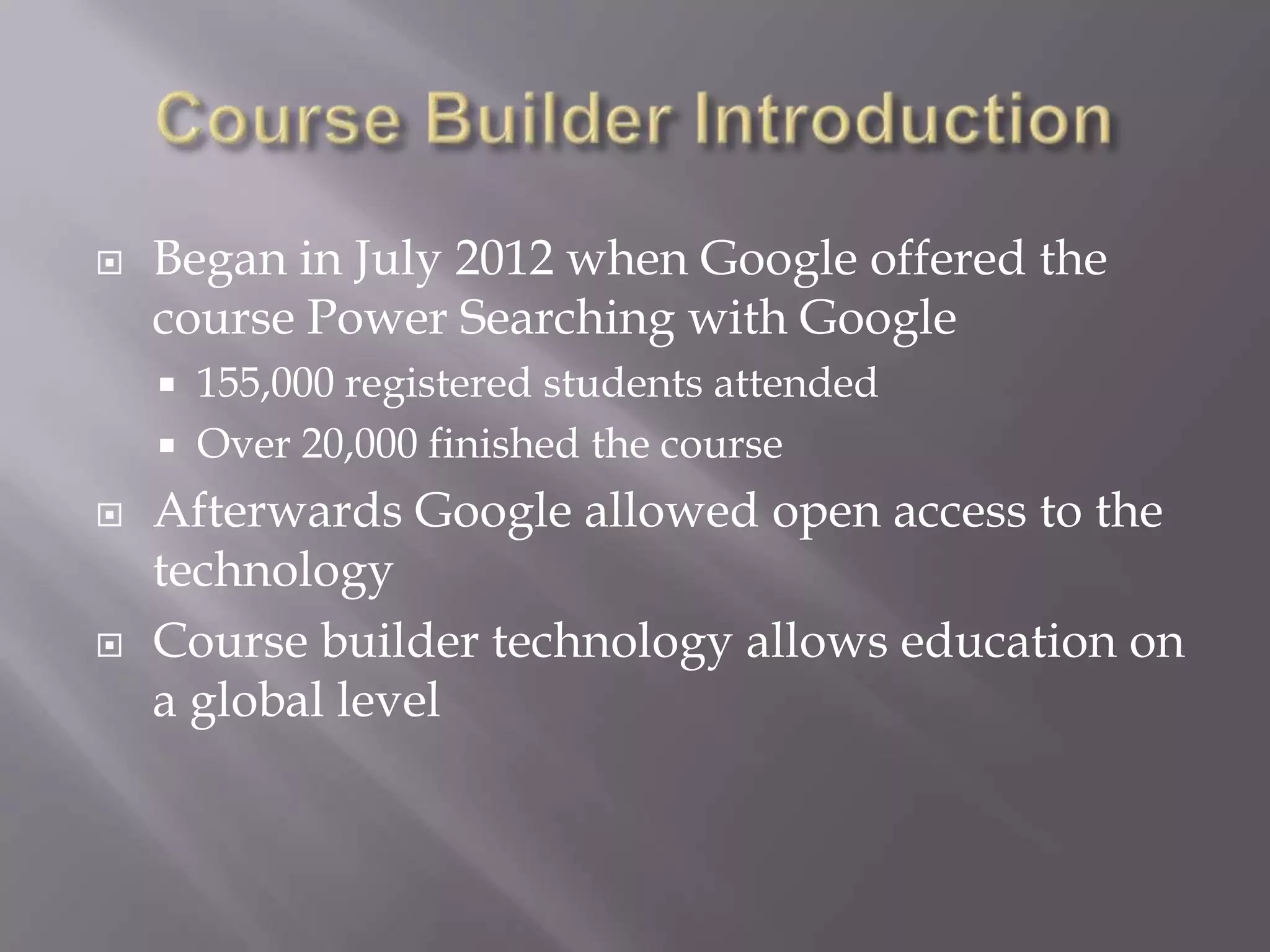 Massive Open Online Courses (MOOCs) began in 2012 with Google's Power Searching course which had 155,000 registered students. Google then made its course building technology openly accessible. This Course Builder technology allows for online education on a global scale through open source coding and a familiarity with HTML, JavaScript, Python, and Google's App Engine platform. Course Builder is currently used by universities like Indiana University and UC San Diego to create open online courses through MOOCs that are free and flexible for students to participate in, though they may lack interaction.
