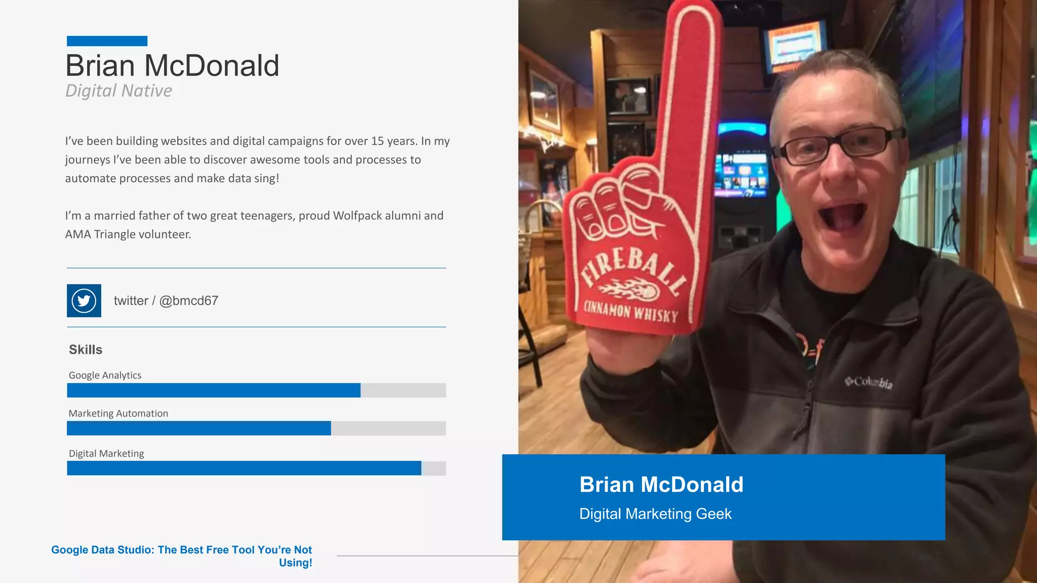 The document highlights Google Data Studio as a powerful, free tool for reporting and data visualization, emphasizing its ease of use with a familiar interface and templates. It outlines various applications, including web analytics, paid search, and social media tracking, while offering guidance on setup, data preparation, and sharing reports. The author, Brian McDonald, shares his expertise from over 15 years in digital marketing to encourage users to leverage this tool for enhanced reporting capabilities.