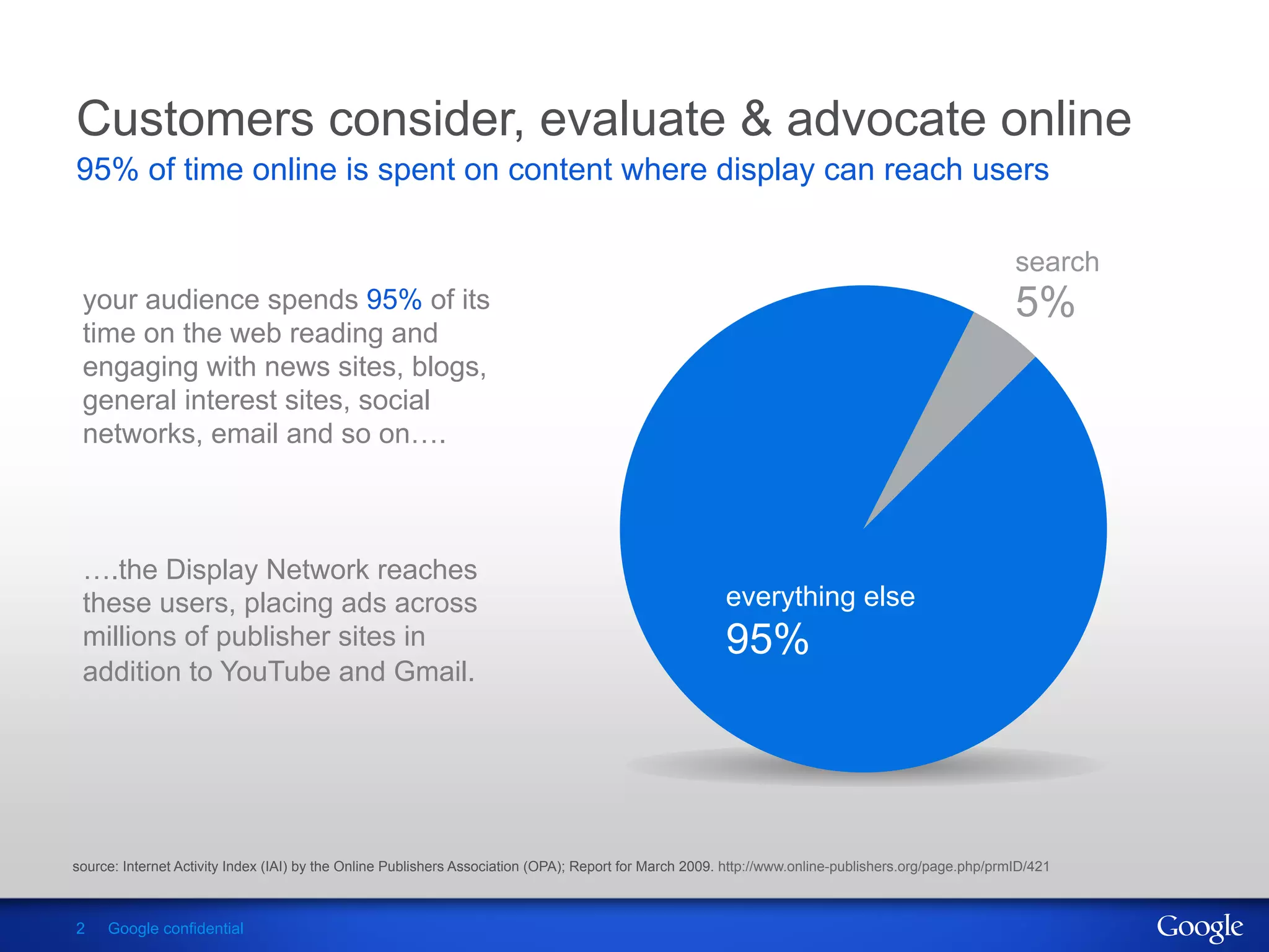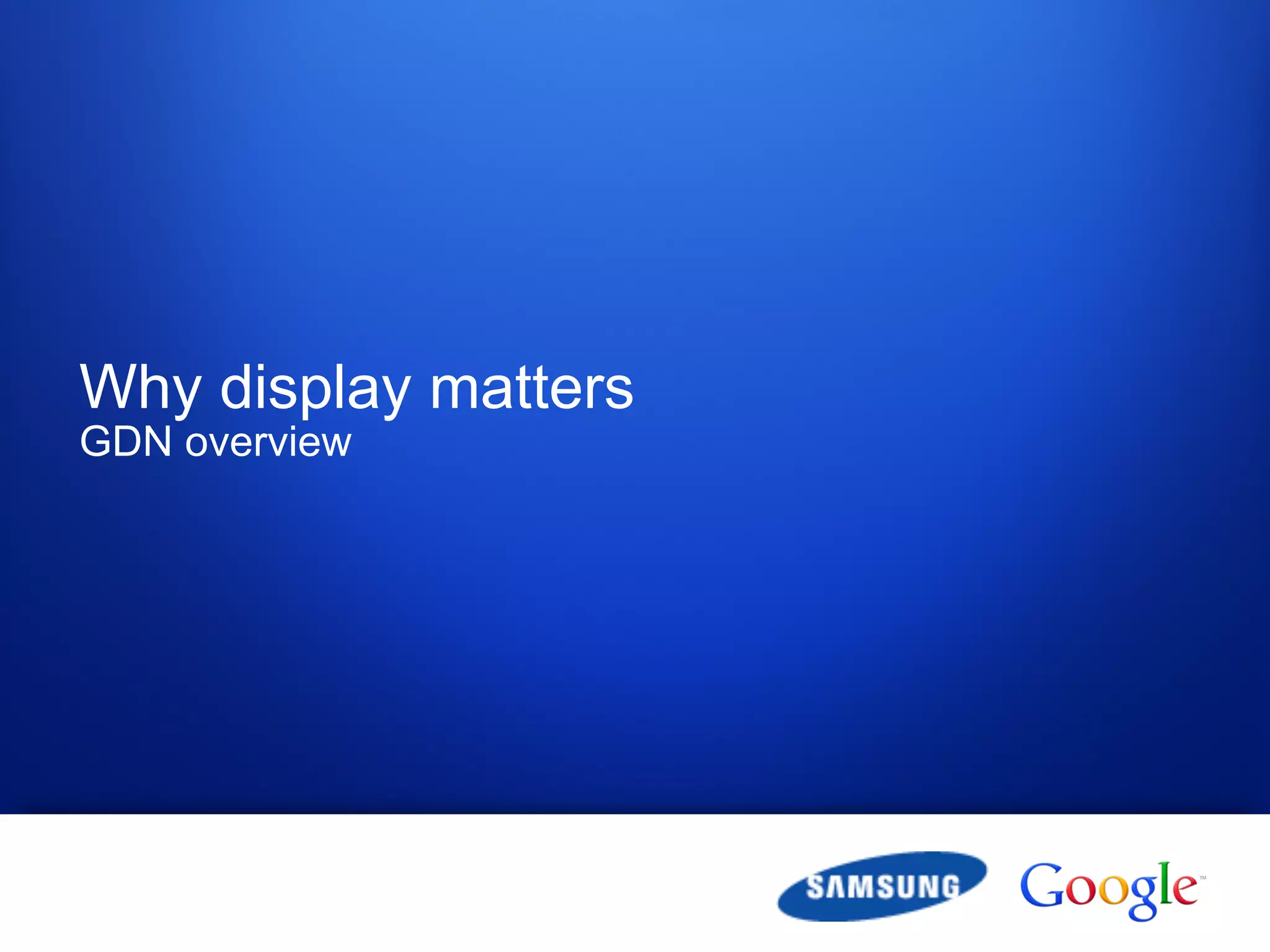 1) The Google Display Network (GDN) allows advertisers to reach users across millions of websites as most users spend 95% of their time online engaged with content where display advertising can be seen.