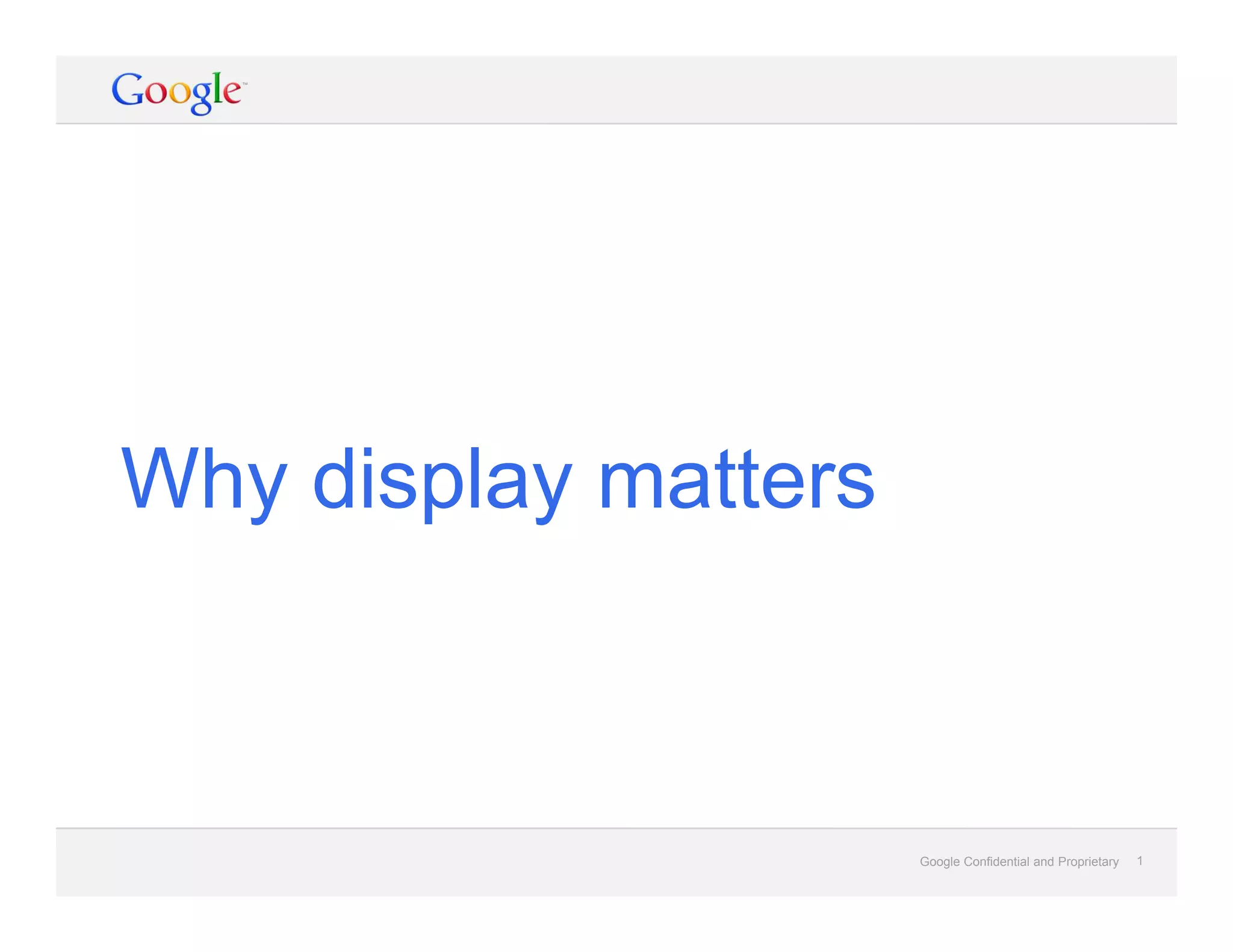 The document discusses the benefits of display advertising and the Google Display Network. It notes that 95% of online time is spent on content where display advertising can reach users. Display advertising can help with brand awareness, reach, conversions, and speeding up the customer purchase cycle. The Google Display Network allows advertisers to reach millions of users across many large and niche publisher sites through different ad formats and targeting options.