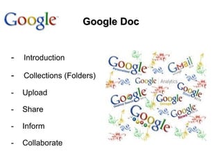Google Docs allows users to create and edit documents online in a web browser without needing to install additional software. Documents are stored in the cloud so they can be accessed from multiple devices and shared with other collaborators, who can view or edit files depending on the sharing permissions. Google Docs also features folders to organize documents and a sharing function that enables users to collaborate simultaneously on a single document in real-time.
