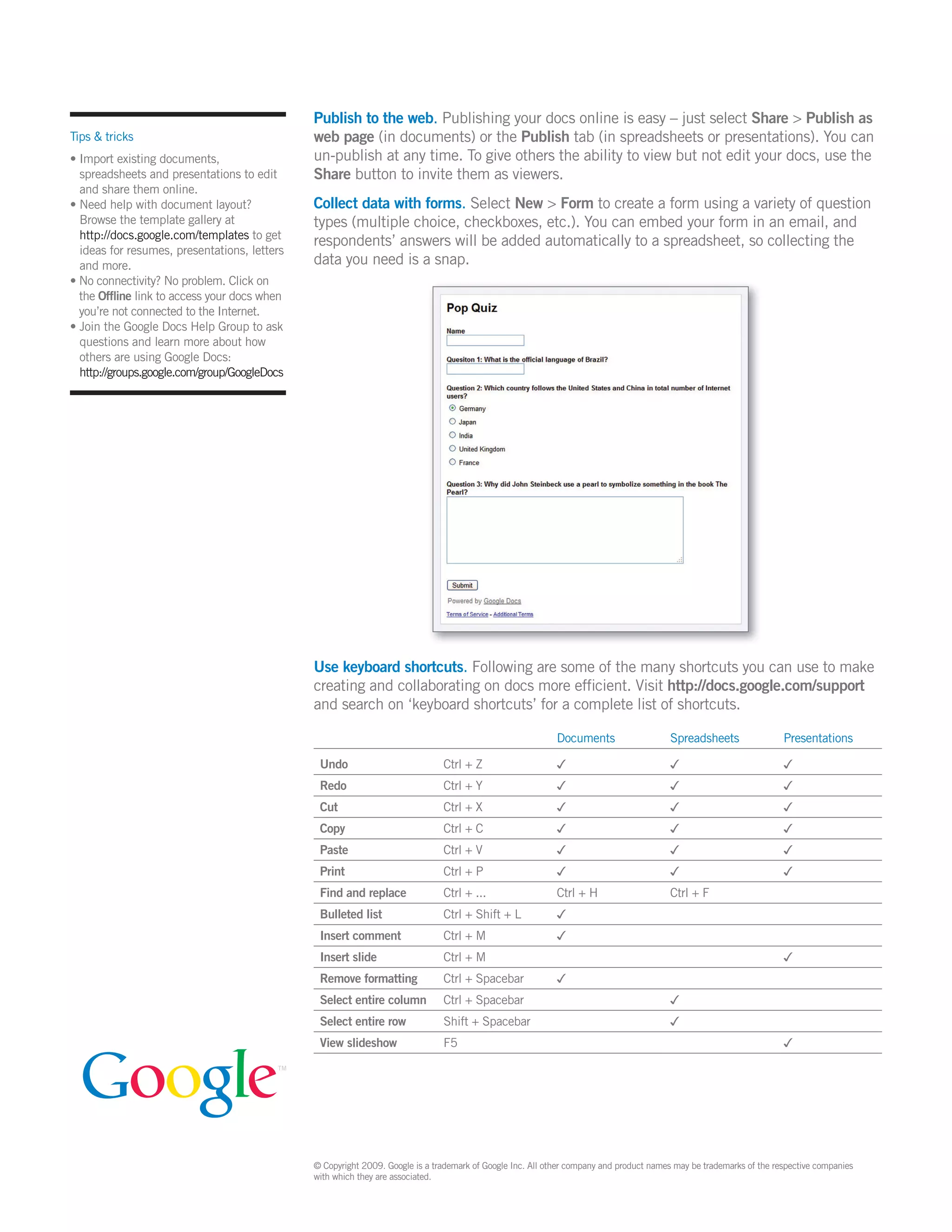 Google Docs allows users to create, edit, and share documents, spreadsheets, and presentations for free online. Documents are stored securely on Google servers so they can be accessed from any device with an internet connection. Multiple people can collaborate on documents simultaneously. Google Docs also enables users to create online forms to collect data from others.