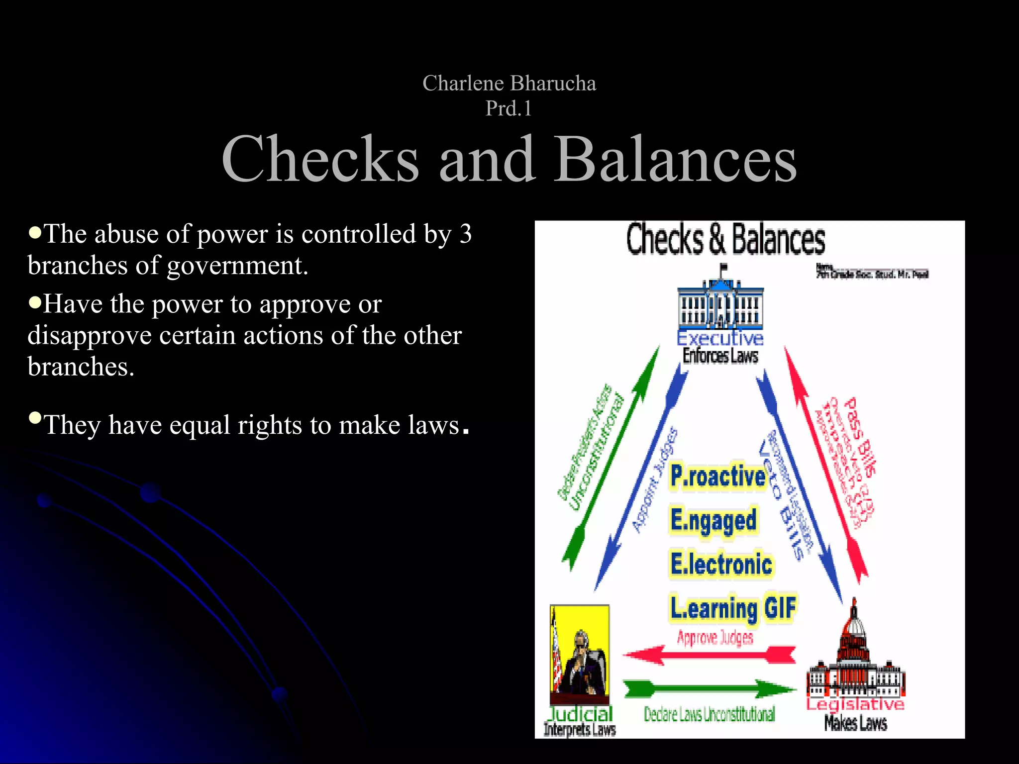 1) Checks and balances divides power between the three branches of government to prevent abuse of power.