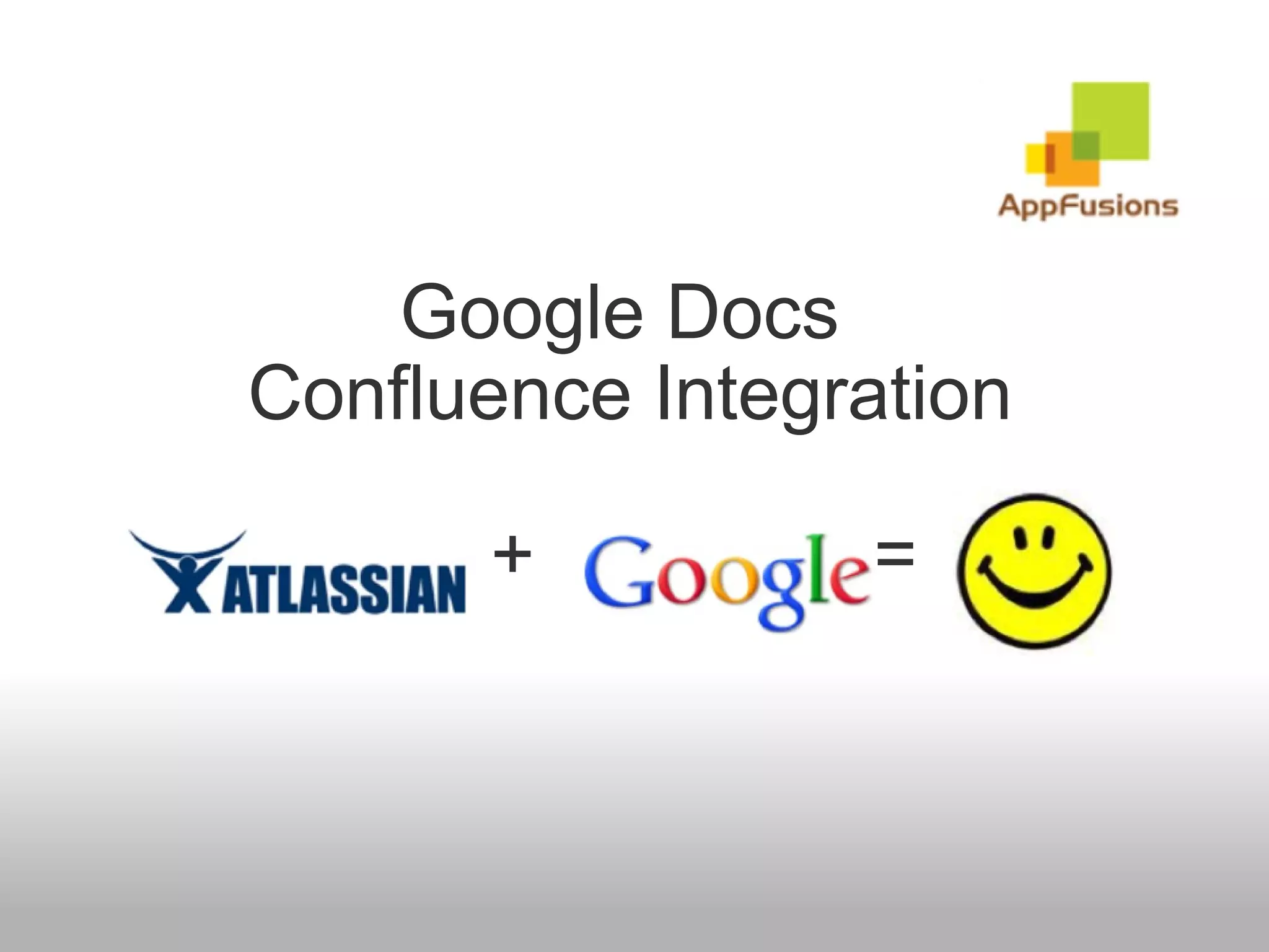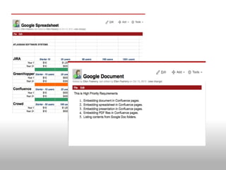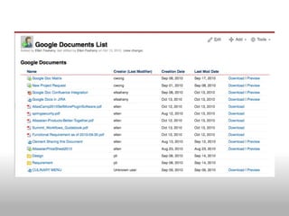 The document discusses integrating Google Docs with Confluence to allow embedding and viewing of Google Docs, Sheets, and Slides files within Confluence pages. It enables authentication using OAuth, listing and embedding files from Google Docs, and including a menu bar for downloading or editing embedded files directly from Confluence.