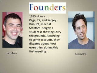 - Larry Page and Sergey Brin met as graduate students at Stanford University in 1995 and disagreed during their first meeting, but later began collaborating on a search engine called BackRub.