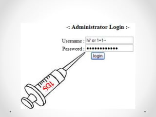 Google dorks are search operators used to refine Google searches. They can be used to access secure webpages, download files, or access security cameras. Common dorks include "site:", "inurl:", "intitle:", and "filetype:" or "ext:". SQL injection is a code injection technique that exploits security vulnerabilities in database applications. It works by inserting SQL commands into user input fields to alter the meaning of SQL queries and gain unauthorized access to databases. Defenses include input validation, prepared statements, limiting privileges, and intrusion detection systems.