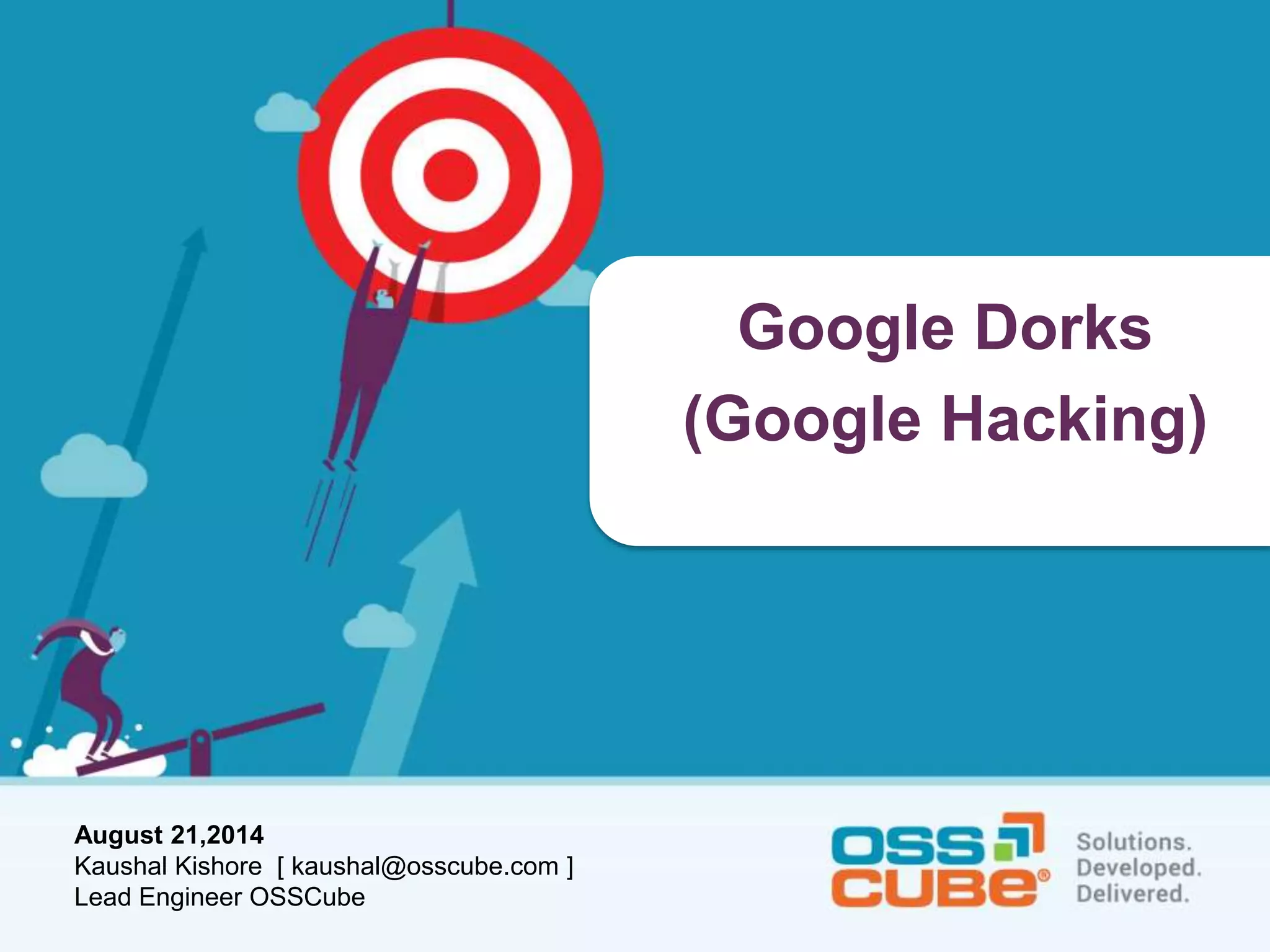 Google dorks, also known as Google hacking, involves using specific search operators and techniques on Google to find sensitive information on websites. Some key points made in the document include: