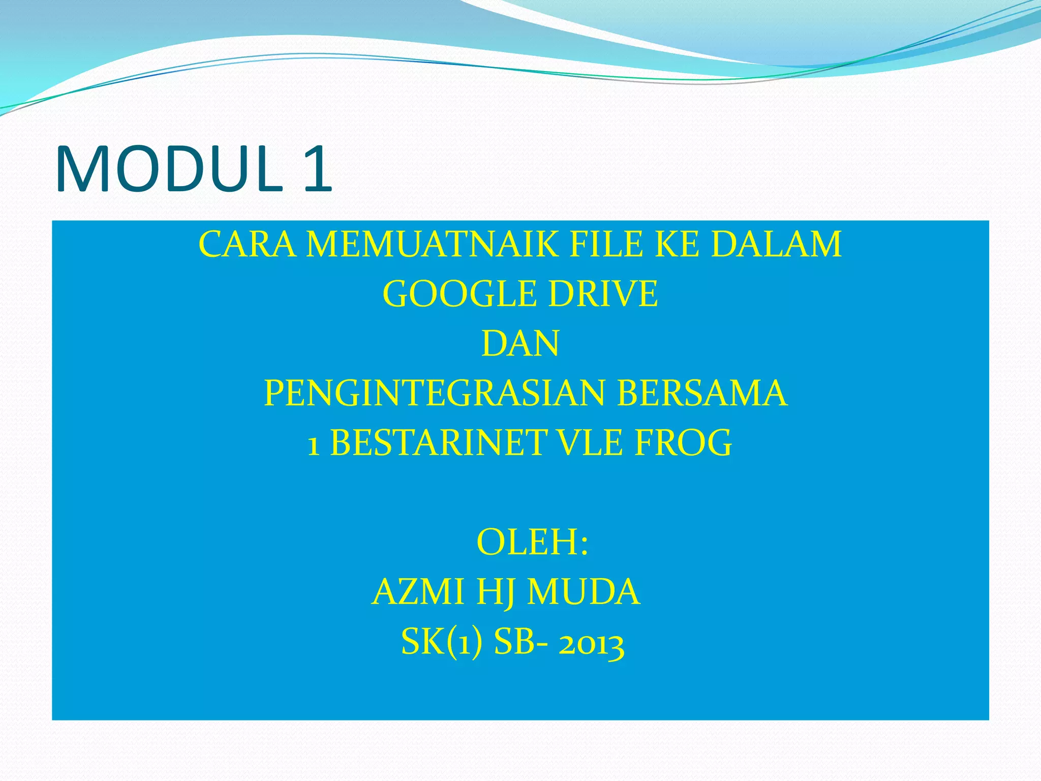 Dokumen ini menjelaskan cara memuatnaik file ke Google Drive dan mengintegrasikannya dengan platform VLE Frog. Langkah-langkah mencakup penggunaan fungsi upload, pengaturan sharing, dan penyisipan link ke dalam VLE Frog untuk interaksi online. Penulis juga menyampaikan tips untuk berbagi dan mengatur pengaturan berbagi file.