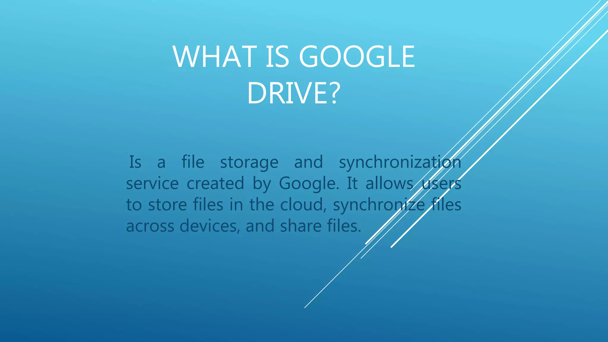Google Drive is a file storage and synchronization service that allows users to store files in the cloud, synchronize files across devices, and share files. It includes Google Docs, Sheets, and Slides for collaborative editing of documents, spreadsheets, presentations, and more. Google Drive provides unlimited storage for files, folders, and backup for $10 per month per user, and synchronizes business files across computers, phones and tablets for easy access. Users can access additional G Suite applications like Forms, Sites, Calendar, and Hangouts through their Google Drive account.