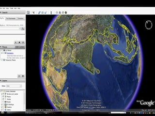 Google Earth is a virtual globe program that displays satellite images of Earth allowing users to view locations from above. It supports 3D models and GIS data. Users can search locations, enter coordinates, view places in 23 languages. Features include Street View, a flight simulator, and sky viewing mode to see stars. It requires basic system specifications and is available in free, Plus, and Pro versions with different export and data options.