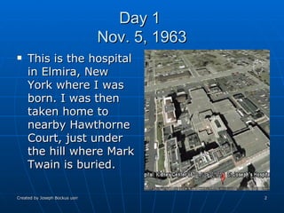 The document is a collection of satellite images showing locations from the author's life over several decades, beginning with his birthplace in Elmira, New York. It traces his moves between houses and apartments in New York, Virginia, California, and Florida as a child and teenager. The images also show schools he attended. Later images track his time in college and buying his first house. The document concludes by outlining the journey of the epic hero Beowulf from Sweden to Denmark as depicted on a map.