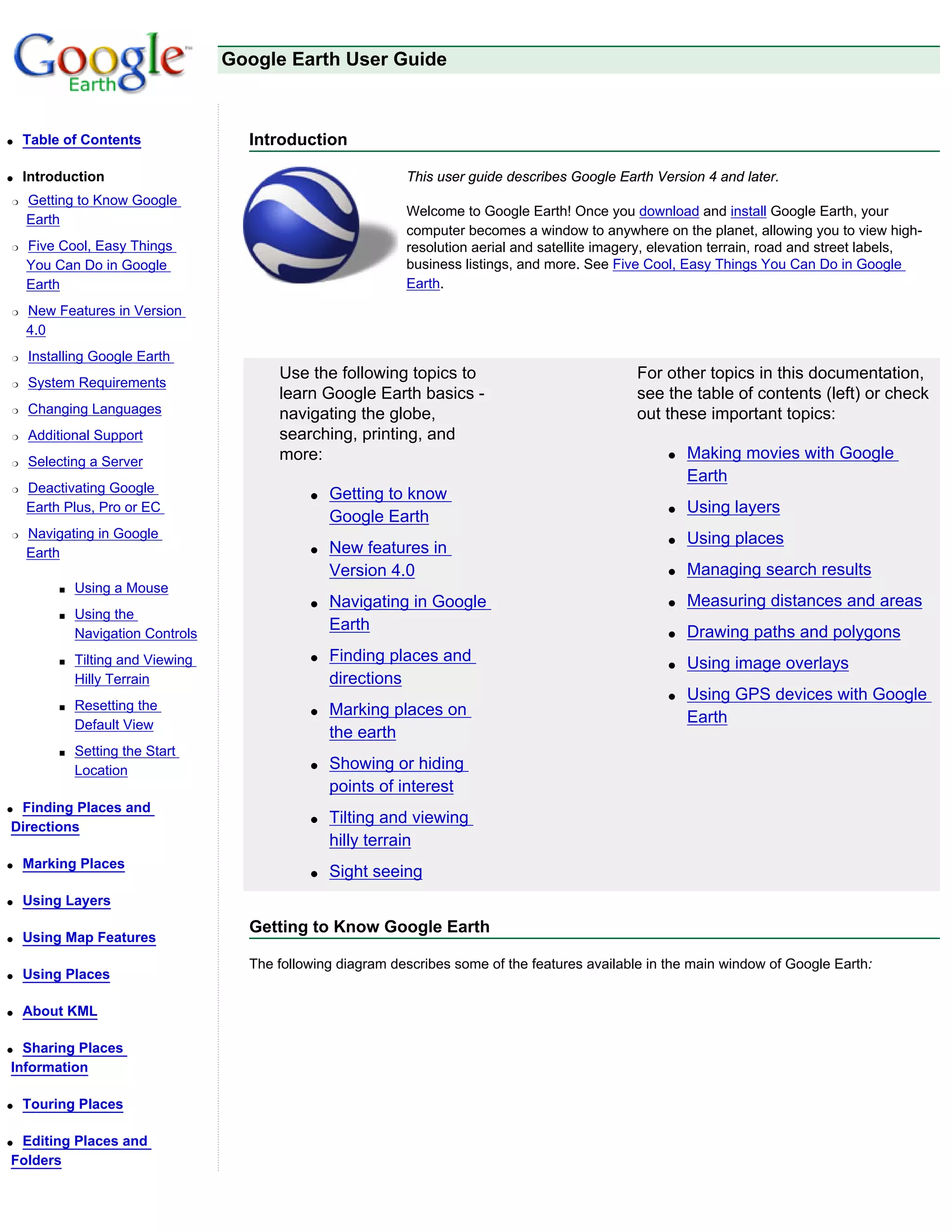 This document provides a user guide for Google Earth. It introduces Google Earth's main features and interface. It describes how to navigate the globe, find places, add markers, and use layers. It also outlines system requirements and how to install Google Earth, as well as new features in Version 4.1 like support for additional languages and displaying the current view in Google Maps.