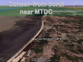 Google Earth is a geographic browser that allows users to view satellite imagery and geospatial data of Earth. It displays satellite images of varying resolution, from 15 meters up to half a meter, depending on the area. Users can explore locations through interactive 3D viewing and fly anywhere on Earth. Google Earth also allows users to view and share user-generated geospatial data and location-specific information through KML files. It has applications in various fields like education, telecommunications network planning, and commercial purposes like site research.