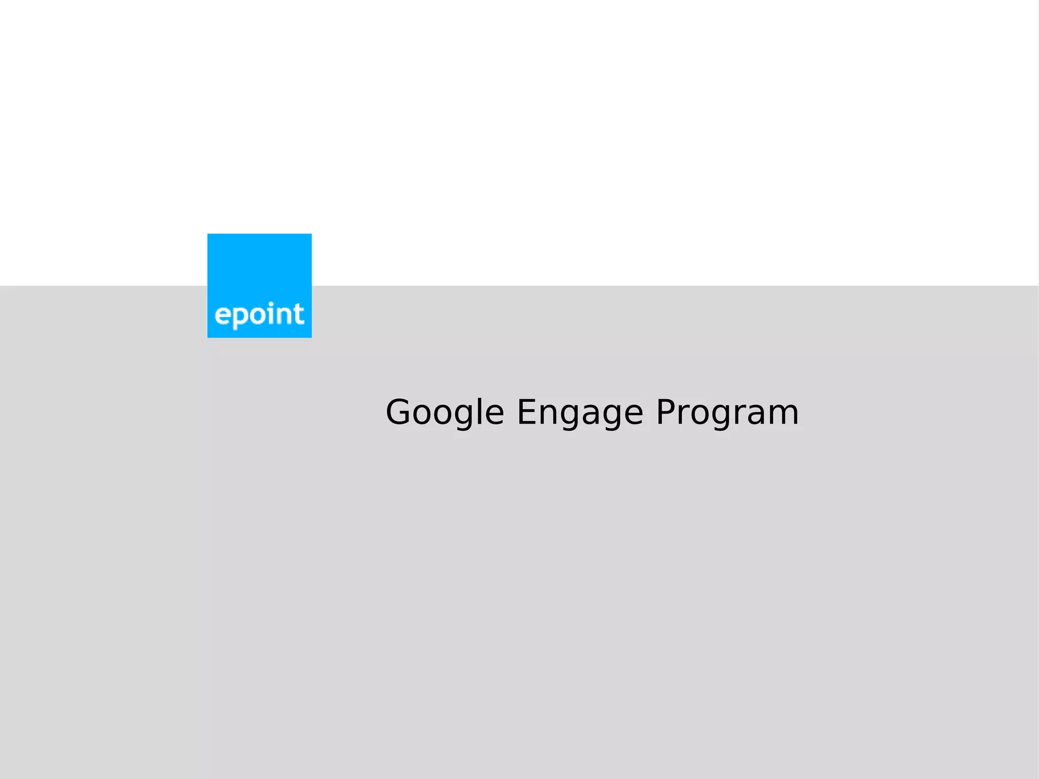 The Google Engage Program provides free training and resources to help people learn about and implement Google AdWords. The training includes lessons on the basics of search advertising, generating business with AdWords, optimizing AdWords accounts, and managing multiple AdWords accounts. Participants can receive $2,000 in free AdWords credits upon completion. The goal is to engage and connect people to build a better paid search industry.