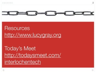 This document provides an overview of Google tools for educational use, including Google Sites for creating class hubs, Google Maps and Earth for exploring locations, and Google+ and Hangouts for communication and collaboration. The agenda covers using Google Sites as a class resource repository, creating maps and exploring locations with Google Maps and Earth, and videoconferencing and screensharing with Google+ Hangouts. Additional resources are also provided.
