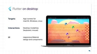 This document discusses Flutter, a Google-developed UI toolkit for building mobile apps using the Dart programming language. It highlights key features of Flutter like compiling to native code, not relying on OEM widgets, and providing a single codebase for both Android and iOS. It covers topics like Flutter's widgets, animations, productivity benefits, and IDE support. Examples of beautiful apps built with Flutter are showcased. The document concludes with recommendations on how to get started with Flutter, like using it for part of an existing app or prototyping a new idea.