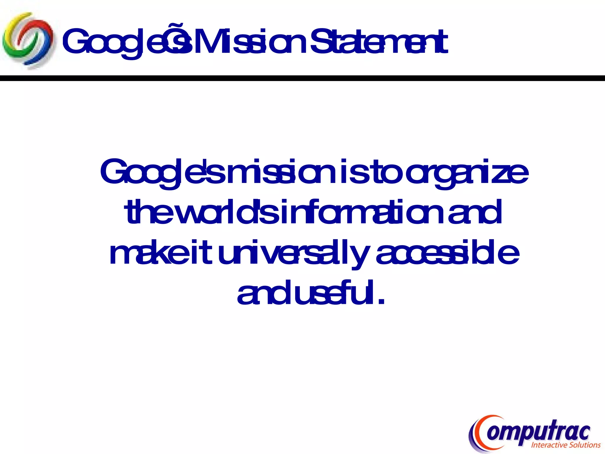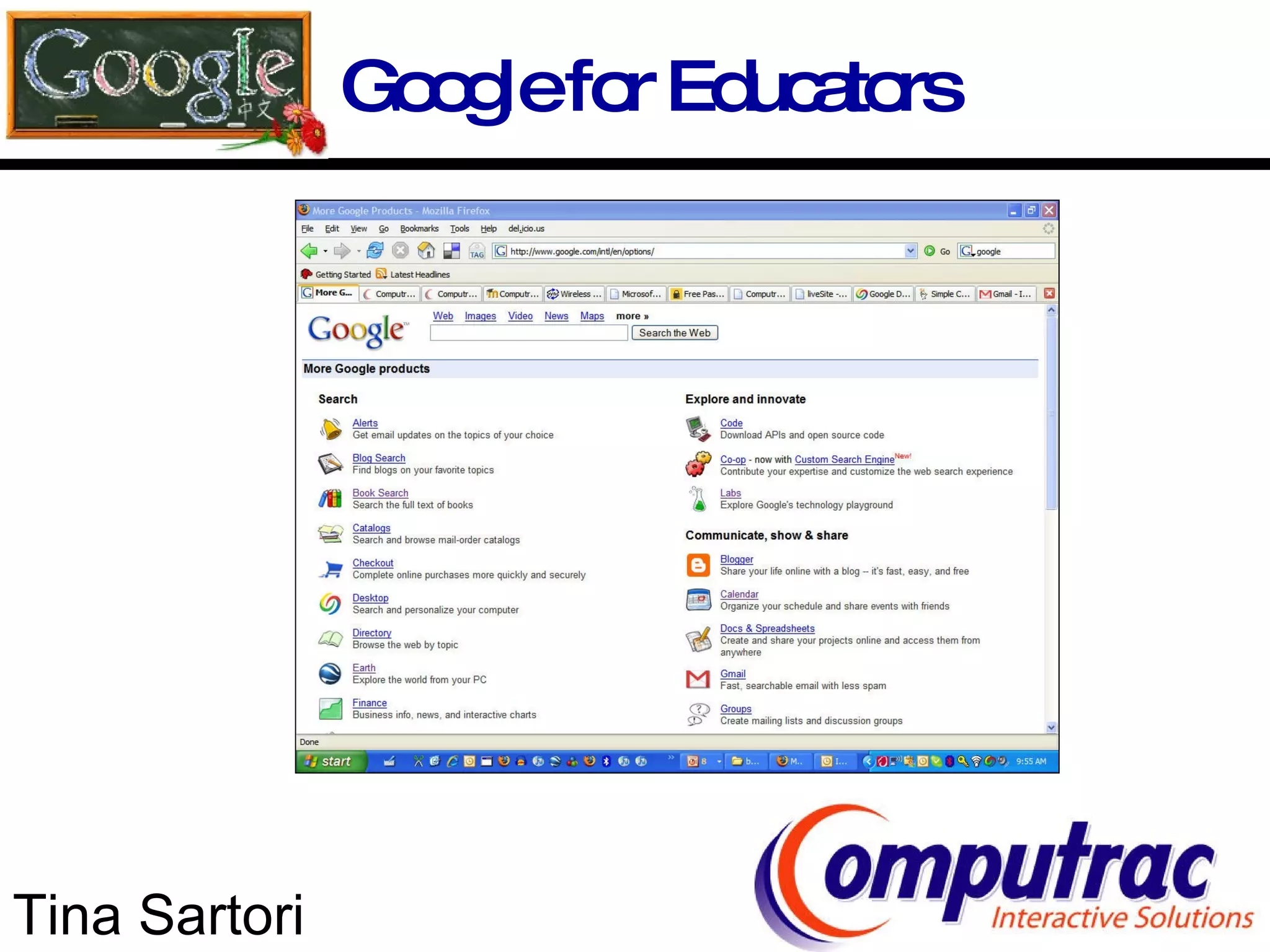 Google's mission is to organize the world's information and make it universally accessible and useful. The document then lists and briefly describes several Google products and services for education including Gmail, Calendar, Docs, Images, Alerts, Earth, Books, Blogger, News, Translate, and Labs. It encourages using Google to find PowerPoint presentations and provides contact information for Tina Sartori.