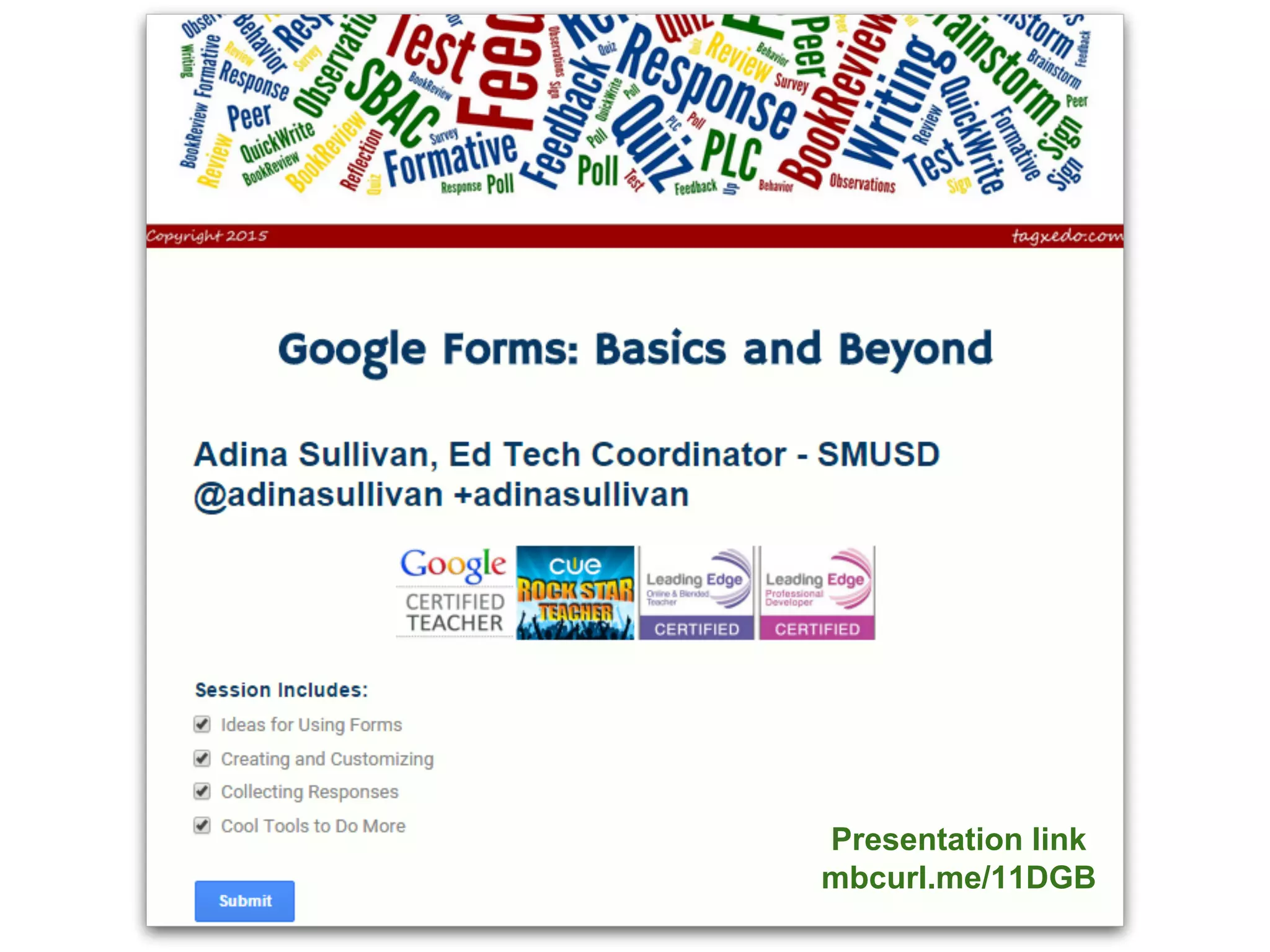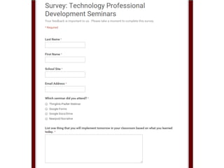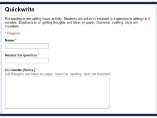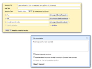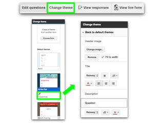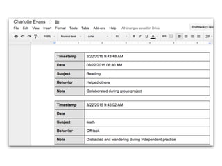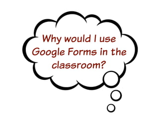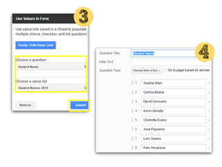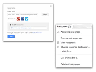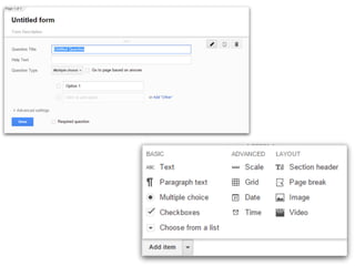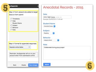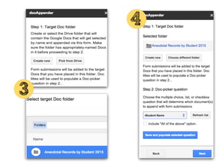 This document discusses various add-ons that can be used to enhance Google Forms. It describes Form Limiter, Choice Eliminator, and Form Values which allow limiting responses, eliminating answer choices, and storing regular response lists. It also mentions Doc Appender which appends question responses to Google Docs, enabling uses like anecdotal records when combined with Form Values. The document provides links to these add-on's support sites and a help video. It concludes by listing additional resources for Google Form templates, innovative uses, and add-on tutorials.