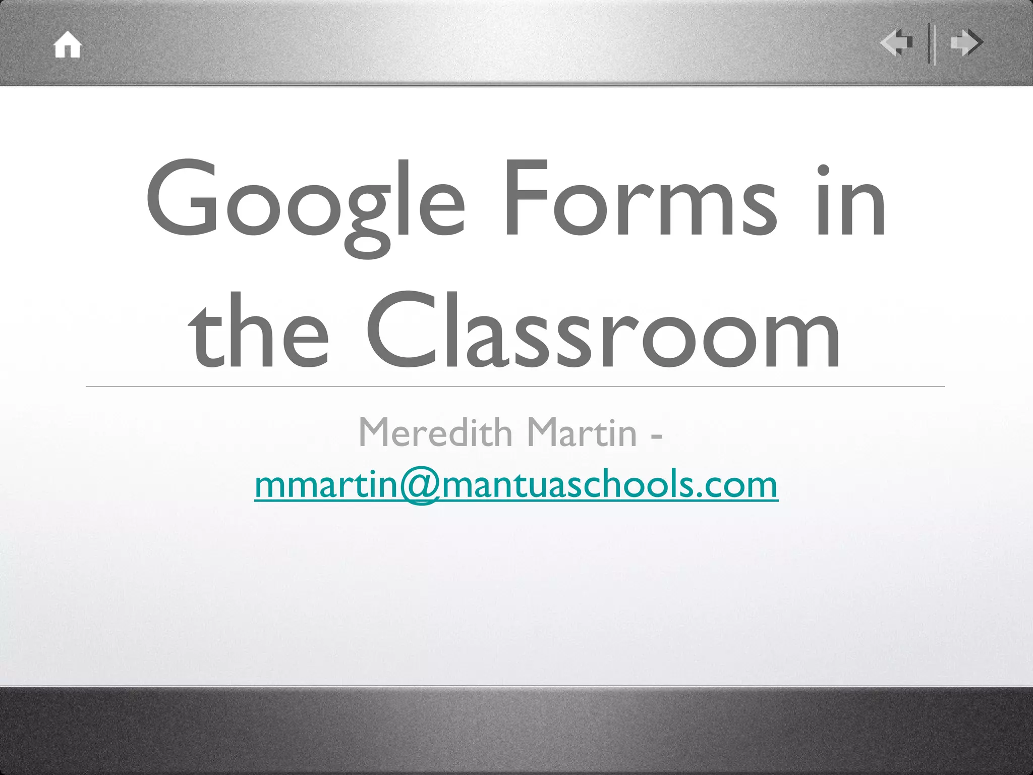 Google Forms allows teachers to easily create web forms and surveys that collect responses in a spreadsheet. Teachers can access Google Forms through their Gmail account in Google Drive. Forms can be public or private. Common uses of forms include self-grading quizzes, surveys, feedback forms, and data collection. The document provides examples of different types of forms teachers can create and shares additional ideas for implementing forms in the classroom.